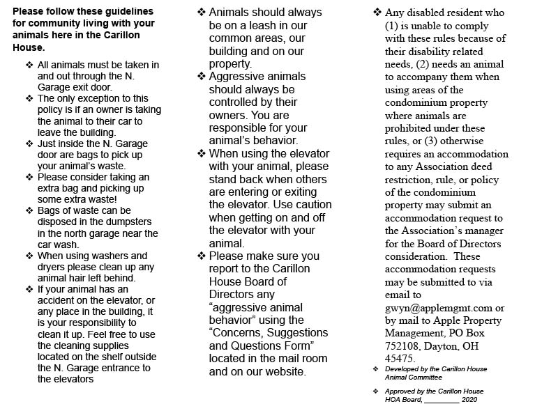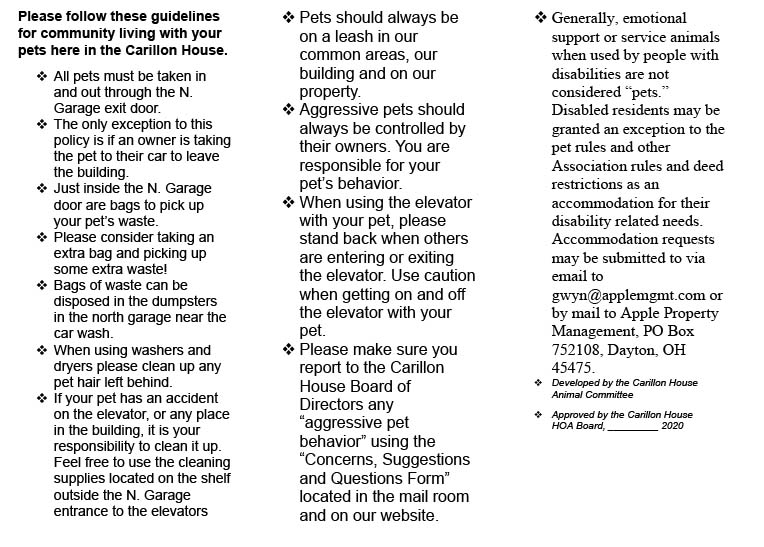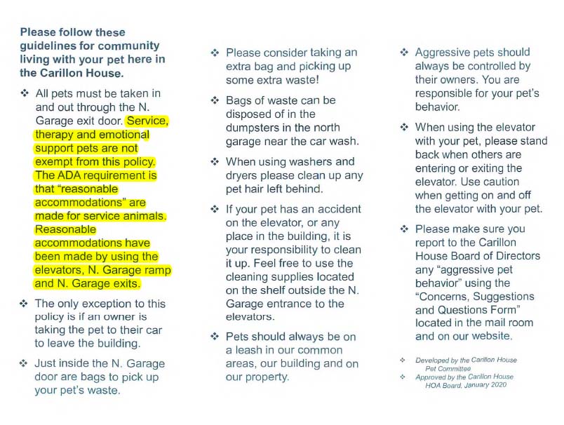 As a resident of Carillon House, I arrived home from work at the Miami Valley Fair Housing Center (MVFHC) sometime the week of March 2, 2020, to find the “Pet Etiquette Brochure” in our mailbox. I read the brochure and found issues with the language in the brochure that said: