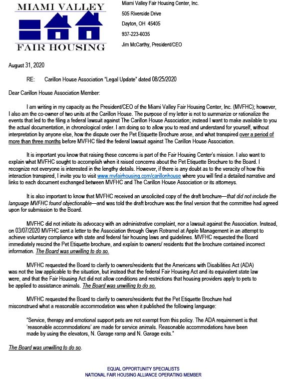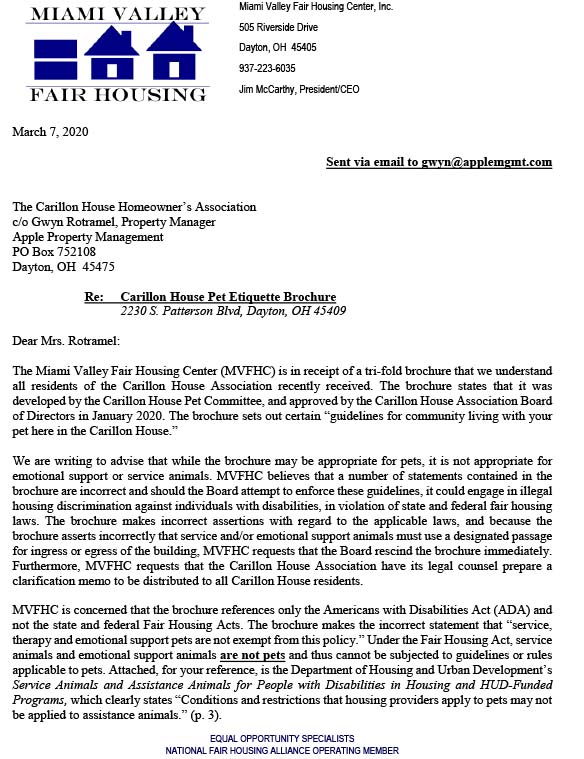 On September 2, 2020, Jim McCarthy, the President/CEO of the Miami Valley Fair Housing Center (MVFHC), sent a letter to the residents of the Carillon House inviting them to come to this web page to review his narrative (see below) of the events involved in MVFHC’s interactions with the Board of the Carillon House Association regarding their new pet etiquette brochure. See Letter to residents of the Carillon House.
