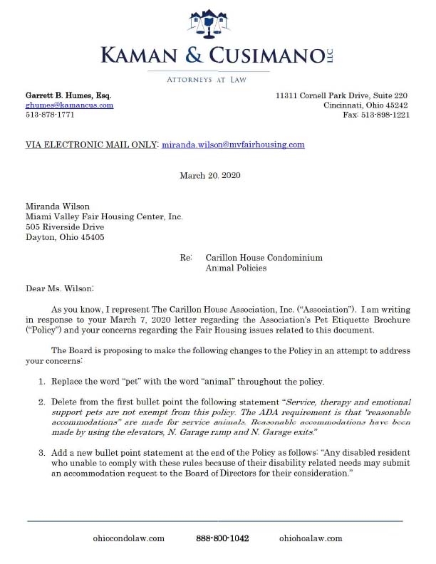 The Fair Housing Center received no response for nearly two weeks. The Board chose not to engage directly with MVFHC and work out a cost-free resolution; instead, the Board turned the matter over to the Association’s legal counsel, Kaman & Cusimano LLC. Garrett Humes, an attorney with Kaman & Cusimano, wrote in response to MVFHC’s letter on 03/20/2020. The letter said the board proposed making three changes to the policy in response to MVFHC’s concerns. See Letter from Garrett Humes of Kaman & Cusimano (3/20/2020).
