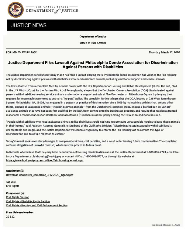 4. The DOJ News Release, dated 03/12/2020, that showed the U.S. Department of Justice under the Trump Administration filing a federal lawsuit arguing that the condo association had “policies, that, among other things, exclude all assistance animals—including service animals—from the Dorchester’s common areas,”