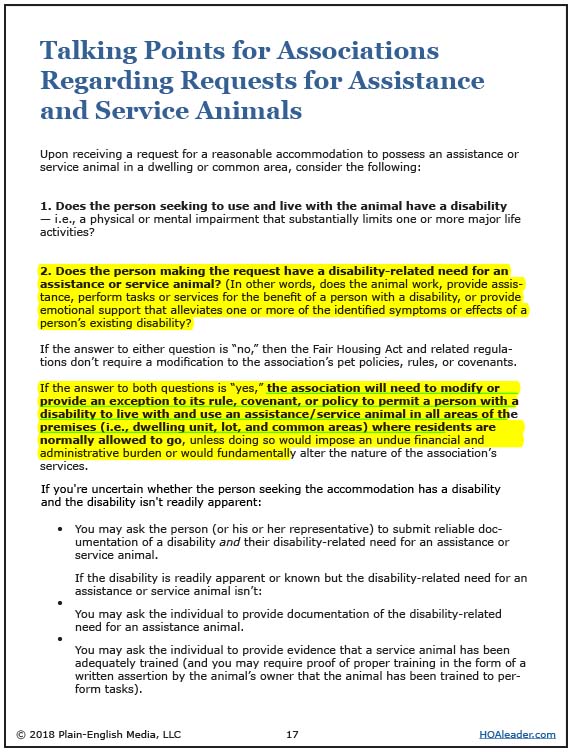 In further research, I found that each of these Special Reports from HOAleader.com is valued at $99 per issue for non-members. Additionally, I discovered that one was a 42-page booklet called Pets at Condos and HOAs: Best Practices for the Challenges that Come with Residents’ Animals. Inside that booklet beginning on page 17 is a feature called Talking Points for Associations Regarding Requests for Assistance and Service Animals, in regard to assistance and service animals suggests: