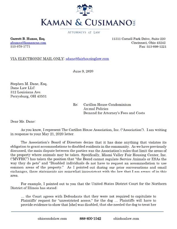 On May 21, 2020, Mr. Dane and Mr. Humes spoke by telephone and then Mr. Dane sent a letter to Mr. Humes formalizing MVFHC’s request that the Carillon House Association reimburse it for the diversion of its resources and for attorney fees incurred in connection with the Pet Policy brochure matter. See Letter from Steve Dane to Garrett Humes of Kaman & Cusimano (5/21/2020).