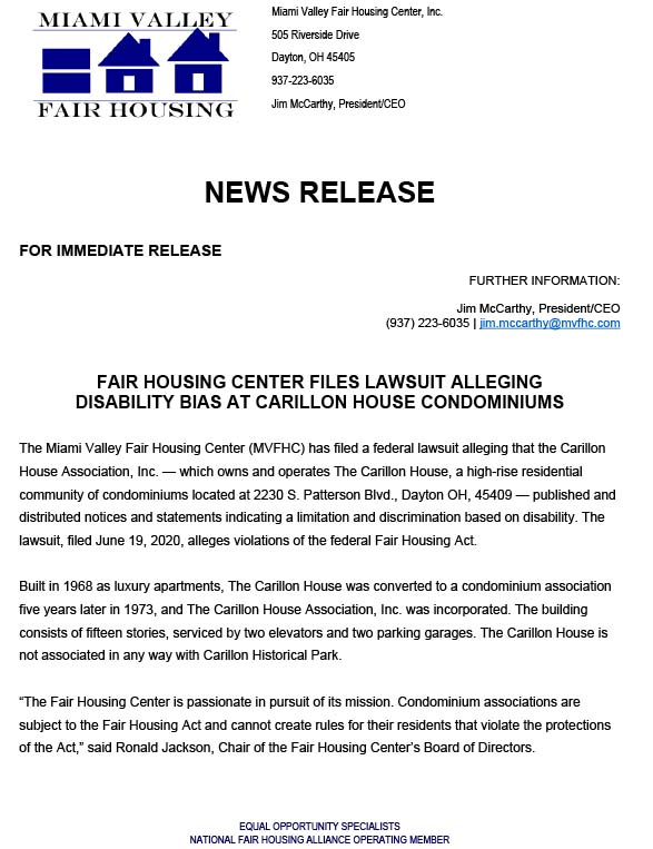 On Monday, June 22, 2020, Carillon House Association Board President, Shauna Adams emailed the owners at Carillon House saying, “I need to inform you that the Carillon House Association is being sued by the Miami Valley Fair Housing Center, Inc. (MVFHC), a small, local, private, non-profit organization.” The email went on to say “Upon the release of the brochure, MVFHC informed us that the language in the brochure had to change to comply with the Fair Housing Act. Despite making the changes as recommended by our attorney, the MVFHC is pursuing a lawsuit against the association.”