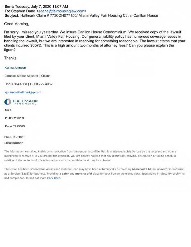 On July 7, 2020, Steve Dane was contacted by Karma Johnson, Complex Claims Adjuster with Hallmark Financial Services, the insurance carrier for The Carillon House Association Board. Ms. Johnson’s email explained “We insure Carillon House Condominium. We received copy of the lawsuit filed by your client, Miami Valley Fair Housing. Our general liability policy has numerous coverage issues in handling the lawsuit, but we are interested in resolving for something reasonable. The lawsuit states that your clients incurred $6572. This is a high amount two months of attorney fees? Can you please explain the figure?”