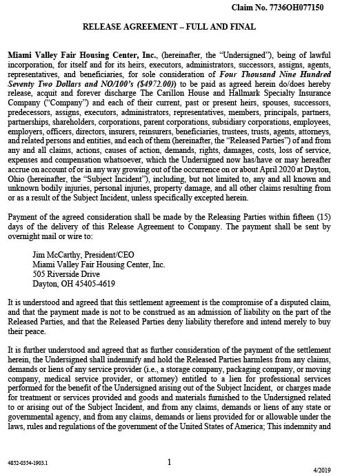On August 25, 2020, the Carillon Board emailed Carillon House owners and residents to update them on the recently resolved legal matter. The letter claimed to include a copy of the final settlement agreement, however the agreement was not attached but is available to you here. With any negotiated settlement of a fair housing lawsuit, the Defendant is given a clause that states there is no admission of liability or fault, in exchange for the money paid and any promises made. Unlike most Defendants against whom MVFHC brings a complaint, the Carillon House Association Board was unwilling to receive training from Miami Valley Fair Housing Center—or any other source—with the goal of avoiding any additional violations, and unwilling to make any promises as to future compliance as part of the settlement. Therefore this settlement only involved money. See Carillon House legal update (8/25/2020).